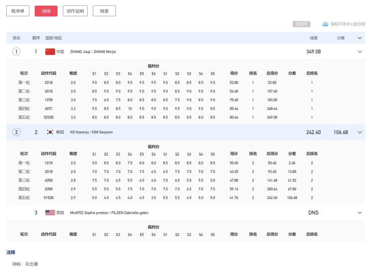 张家齐/掌敏洁五跳得分分别为52.80分、54.60分、75.60分、85.44分、80.64分,总分349.08分,比韩国组合多出106.68分。