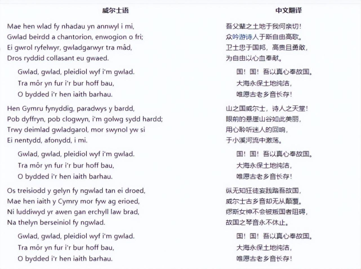 歌词由威尔士诗人埃文-詹姆斯(1809-1878)用自己的母语威尔士语(盖尔语的一支,与日耳曼语系的英语差别很大)所写。表达对于自己的土地,威尔士的热爱。