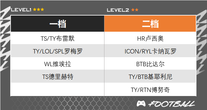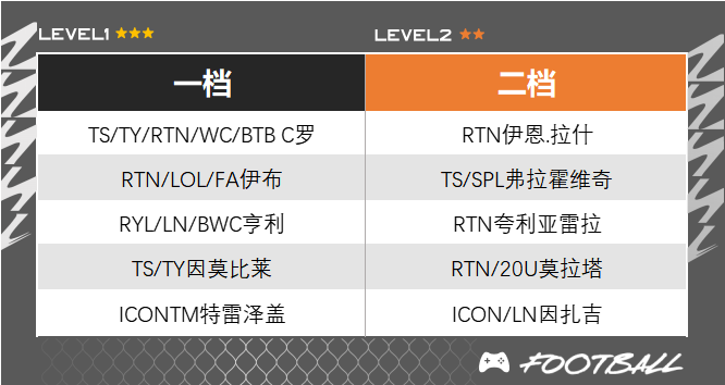 ○ 尤文套的中锋在时刻特雷泽盖上线后迎来了加强,这张双五脚的盖子已经在排位赛的中高端局有了不错出场率,提升了脚下速率以及手感,在禁区里的射术也非常无解。另外,他的强头特性以及超过140的头球数值也很适合下底传中打法。