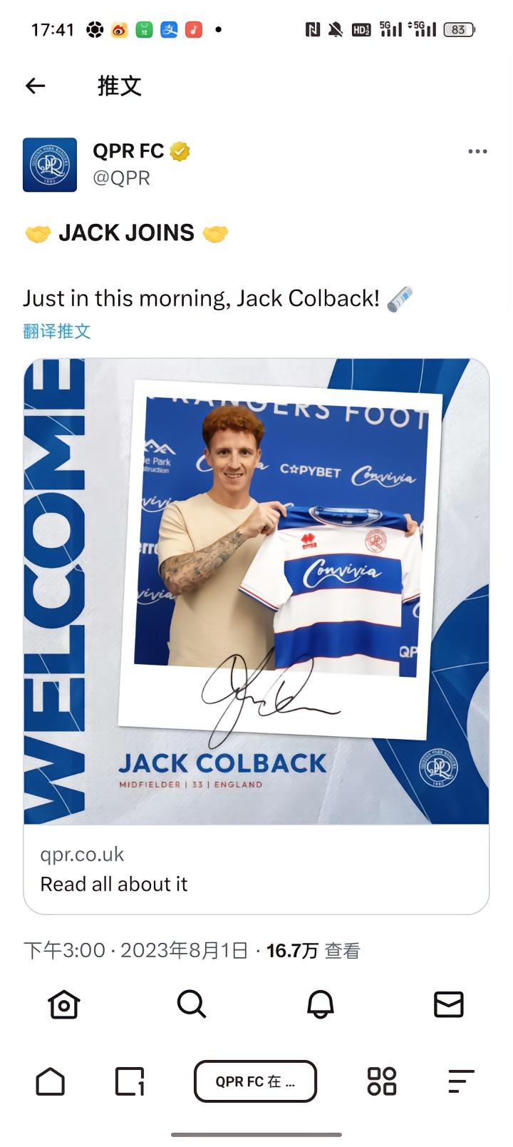 前森林球员杰克科尔巴克自由身转会QPR。Grea...东米德兰诺丁汉森林 @懂球帝2023-08-01 17:44前森林球员杰克科尔巴克自由身转会QPR。Great Jack, best wish.展开更多