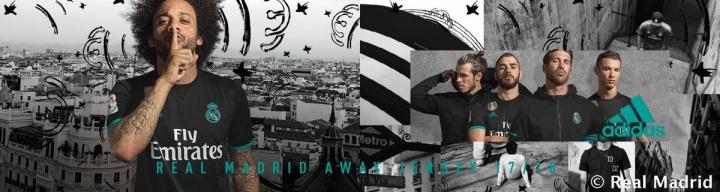 当地时间6月14日,皇家马德里俱乐部官方公布了球队2017-18赛季主客场全新球衣。其中主场新球衣为白青配色,全身配有隐约可见的斜纹条格,球衣肩部仍有传统的“三道杠”;客场新球衣则为黑青配色,赞助商以及队徽的款式依然与2016-17赛季相同,而门将新款球衣的配色为绿色。值得一提的是,此次皇家马德里公布的新款球衣上都印有世俱杯的logo。