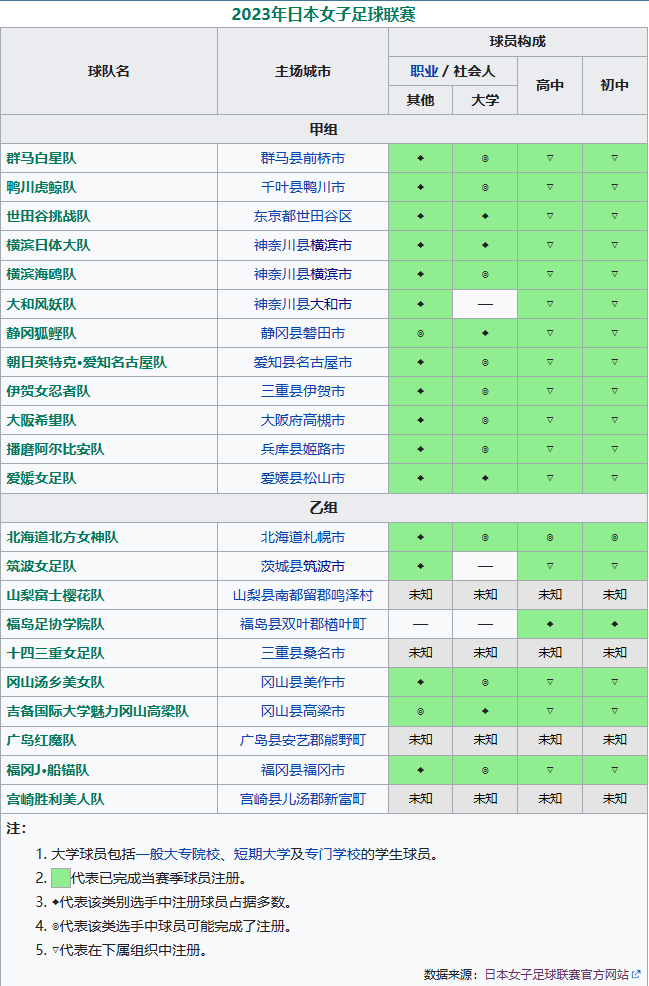 这里我们着重讲讲作为目前日本第二级别联赛的日本女子足球联赛(即抚子联赛),作为日本历史最悠久的女足联赛,日本女子足球联赛曾经长期作为日本国内最高级别的女足联赛,为日本国家队培养了大量球员。从表格中可以看到,这一级别俱乐部的球员构成十分复杂,并不完全依赖于职业球员,同时也给了大学生球员很多机会。