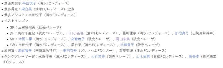 早期日本女子联赛的球队构成十分复杂,有职业男足旗下的俱乐部球队、企业足球队、社会足球队和学校足球队等等,与现今的中国女足联赛体系里的球队构成十分类似。1989年日本首届女子联赛的冠军清水FC(球队与清水鼓动无关),球队的联赛金靴是来自中国台湾的周台英,她在那年的联赛中打入12球,可谓降维打击。参看当年的联赛最佳阵容,我们可以发现一些熟悉的名字,如后来成为日本女足教母的高仓麻子,日本女足联赛多年的MVP野田朱美以及日后成为JFA国家训练中心教练的山口小百合等等。