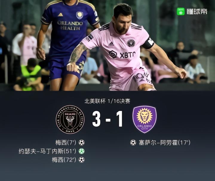 北京时间8月03日北美联杯 1/16决赛,迈阿密国际主场对阵奥兰多城。上半场,开场第7分钟,梅西接泰勒助攻,胸部停球后打进一球,第17分钟,奥兰多城塞萨尔-阿劳霍抽射扳平比分。下半场,约瑟夫-马丁内斯造点+破门,迈阿密2-1领先,第72分钟,梅西再次破门帮助比分3-1领先,全场比赛结束,迈阿密国际3-1战胜奥兰多城晋级北美联杯16强,下一场对阵达拉斯。