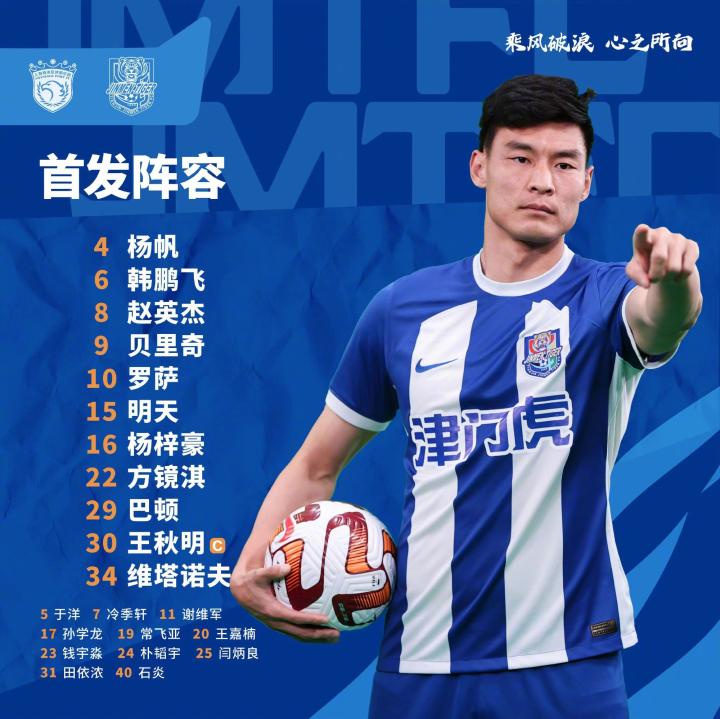 天津津门虎方面,主帅于根伟安排3外援联袂首发,分别是:贝里奇、罗萨、维塔诺夫。王秋明担任场上队长,方镜淇司职门将。其他位置还有:杨帆、韩鹏飞、赵英杰、明天、杨梓豪、巴顿。