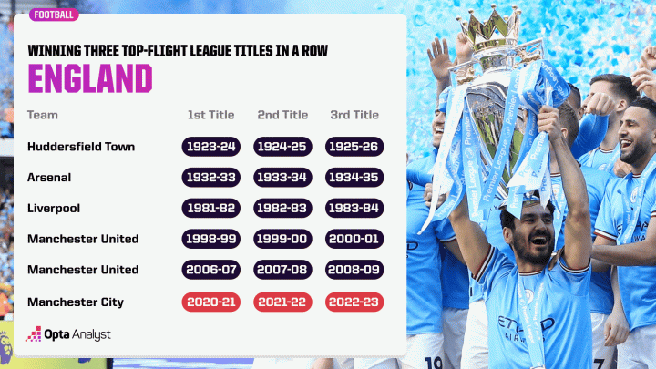 在连续三届夺冠后,曼城的目标是实现英格兰俱乐部此前从未做过的事情——四连冠。