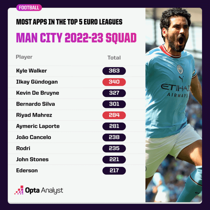 在失去京多安(340场比赛)和马赫雷斯(284场比赛)之后,曼城总共失去了624场联赛经验——他们是2022-23赛季球队中在此类比赛中经验最丰富的五名球员中的两名。如果他们再失去凯尔·沃克(今年夏天有传言称这与拜仁慕尼黑有密切联系),他们就会失去另一名在欧洲顶级联赛中拥有 363 场比赛经验的球员,他是曼城现役球员中出场次数最多的球员。