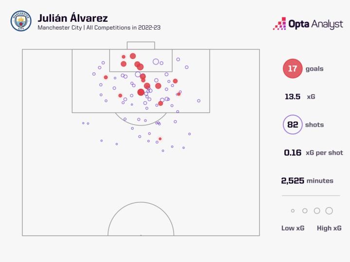 随着京多安和马赫雷斯的离开,阿尔瓦雷斯希望新赛季有更多的上场时间。在2022-23赛季的比赛中,他平均每168分钟非点球进球数要高于马赫雷斯作为曼城球员的五个赛季中的平均水平,这是一个积极的信号。