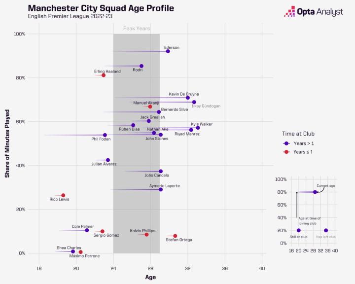 这使得瓜迪奥拉成为上赛季联赛中最稳定的球队之一。没有哪支球队在 2022-23 赛季使用的球员数量比曼城(24 名)少,而西班牙教练能够自由轮换这些球员,避免球队过度劳累。尽管他在整个赛季对首发阵容进行了 106 次调整——上赛季英超联赛中只有饱受伤病困扰的切尔西(139 次)和利物浦(107 次)做出了更多调整——但只有两名外场球员(非门将)的上场时间超过了 75% 的英超上场时间:埃尔林哈兰德(2,776)和罗德里(2,920)。冠军挑战者阿森纳上赛季有六名球员在英超联赛中上场时间至少达到 75%,这是他们最终在赛季末失去动力的关键原因之一。