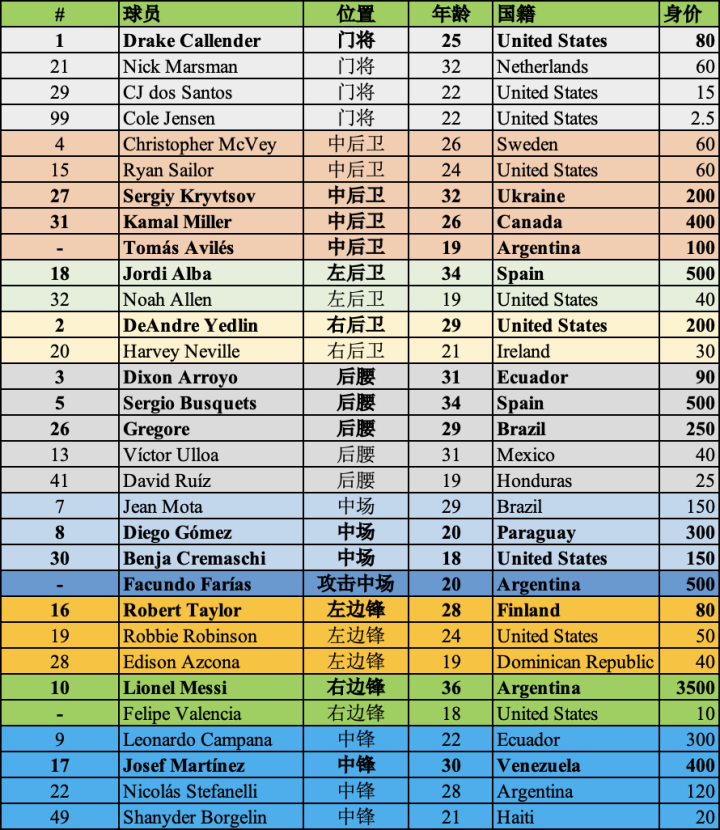 迈阿密在夏窗过后拥有31名球员(弗雷、克伦丁和内赫里赛季报销,不计入内),总身价8272.5万欧元,位列美职联第一。
