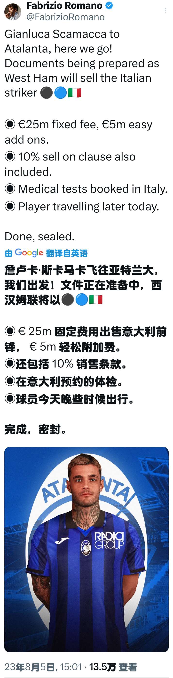 罗马诺消息,斯卡马卡即将加盟亚特兰大,弯道超车国...芳雪愁言 @懂球帝2023-08-05 15:22罗马诺消息,斯卡马卡即将加盟亚特兰大,弯道超车国际米兰和罗马。亚特兰大和西汉姆联已经达成一致,转会文件正在处理中。 斯卡马卡的转会费2500万固定+500万浮动奖金(很容易达成),还有10%二转。今天晚些时候,斯卡马卡将飞到亚特兰大进行体检。展开更多