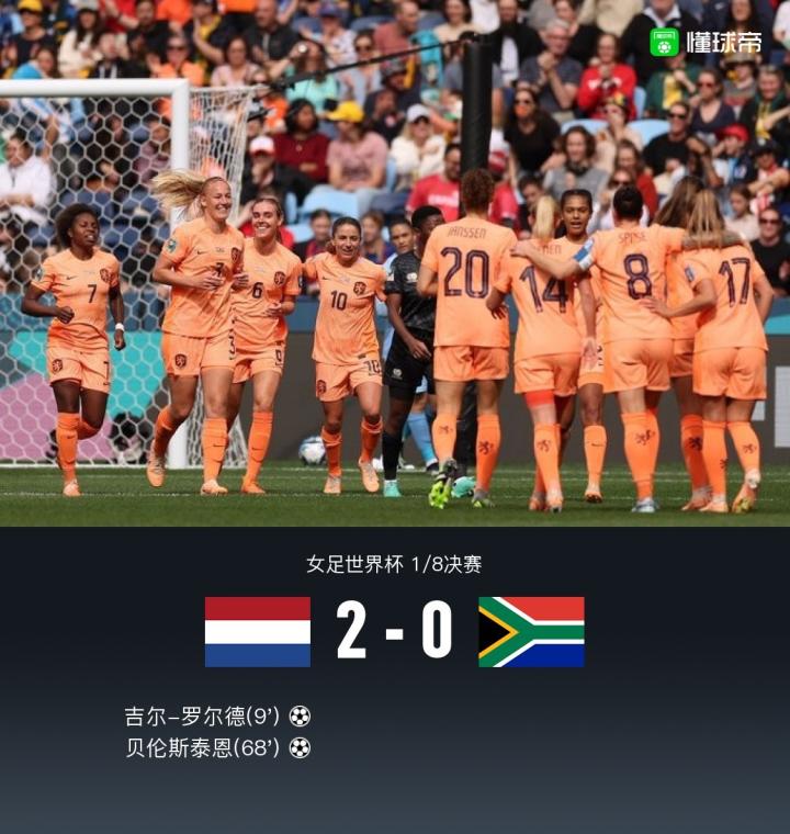 北京时间8月6日10:00,2023年澳大利亚&新西兰女足世界杯1/8决赛,荷兰女足与南非女足在悉尼足球场展开角逐,本场主裁判为山下良美。上半场,吉尔-罗尔德头球补射破门,桑比-克加特拉纳失单刀+屡造险,南非女足两人伤退。下半场,马滕斯助攻贝伦斯泰恩破门扩大优势+两人各一粒进球被吹。最终,荷兰女足2-0击败南非女足,晋级8强,1/4决赛将战西班牙女足。