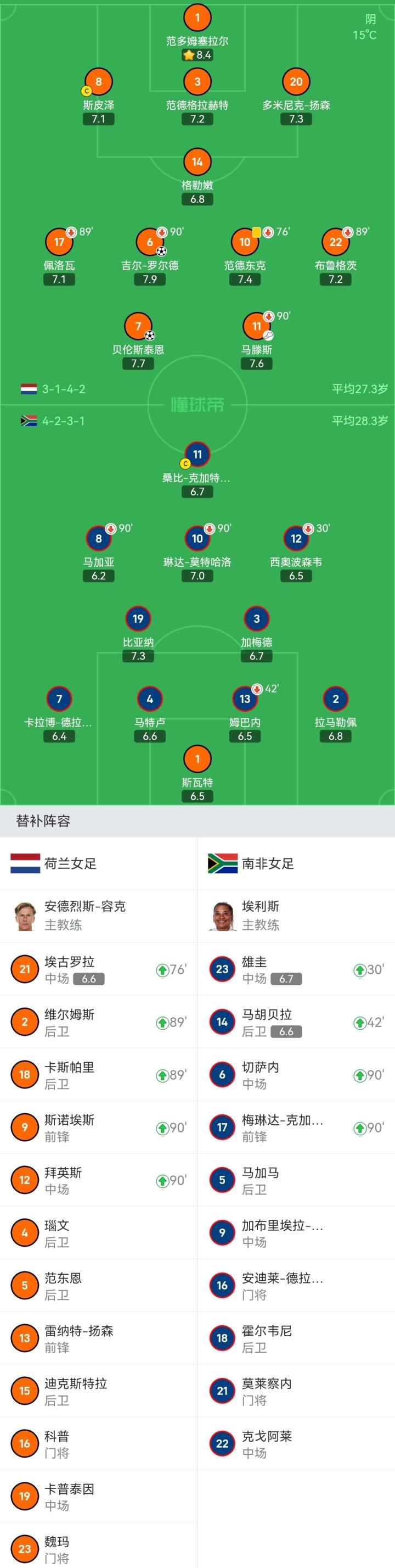 荷兰女足首发:1-范多姆塞拉尔、3-范德格拉赫特、6-吉尔-罗尔德(90+3'9-斯诺埃斯)、20-多米尼克-扬森、22-布鲁格茨(89'18-卡斯帕里)、17-佩洛瓦(89'2-维尔姆斯)、14-格勒嫩、8-斯皮泽、10-范德东克(76'21-埃古罗拉)、7-贝伦斯泰恩、11-马滕斯(90+3'12-拜英斯)