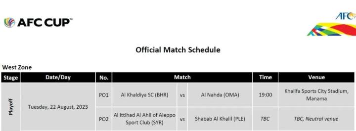 阿勒颇联(叙利亚)VS希伯伦青年(巴勒斯坦),中立场地待定