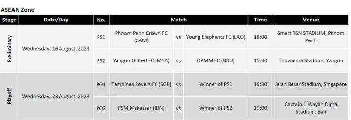 印尼(1+1):巴厘联(正赛,2021–22与2022–23印尼联赛冠军附加赛胜方;如巴厘联通过亚冠资格赛获得亚冠名额则联赛亚军佩西加雅加达递补获得亚足联杯正赛资格),望加锡(资格赛,2021–22与2022–23印尼联赛冠军附加赛负方)