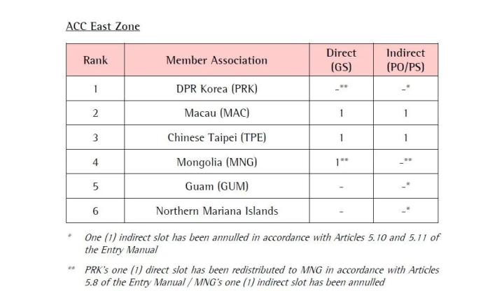 东亚区:3队直接进入正赛,2队参加资格赛争夺一个正赛名额