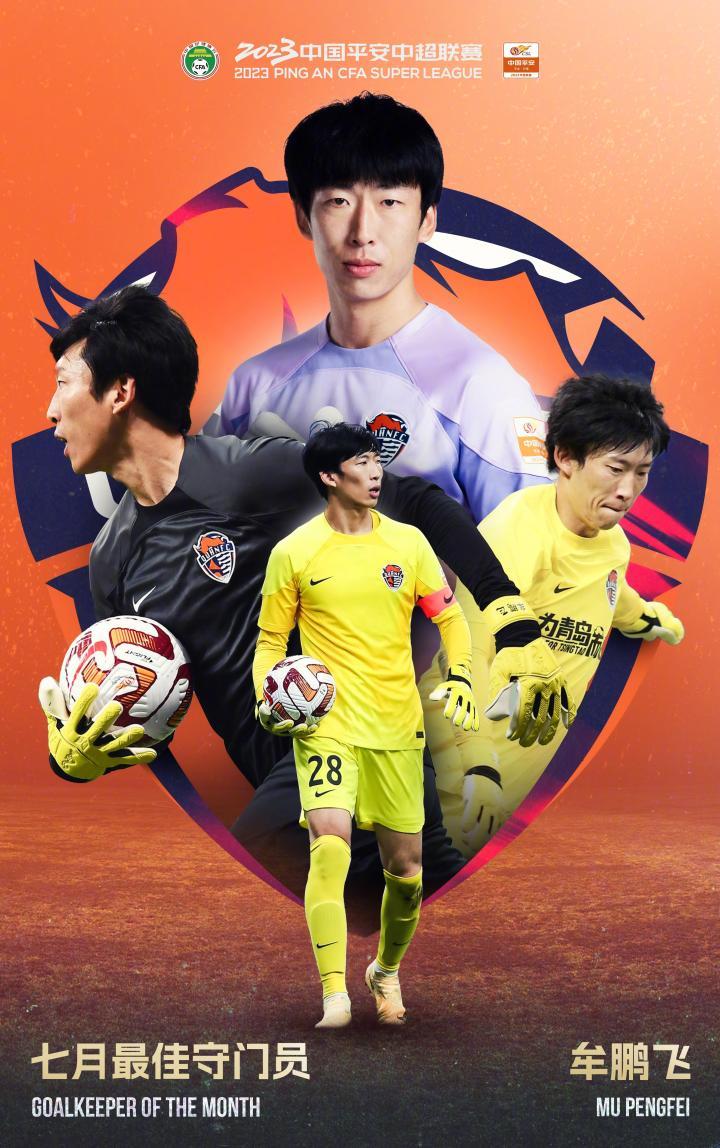 官方消息,青岛海牛门将牟鹏飞当选中超联赛7月最佳守门员。