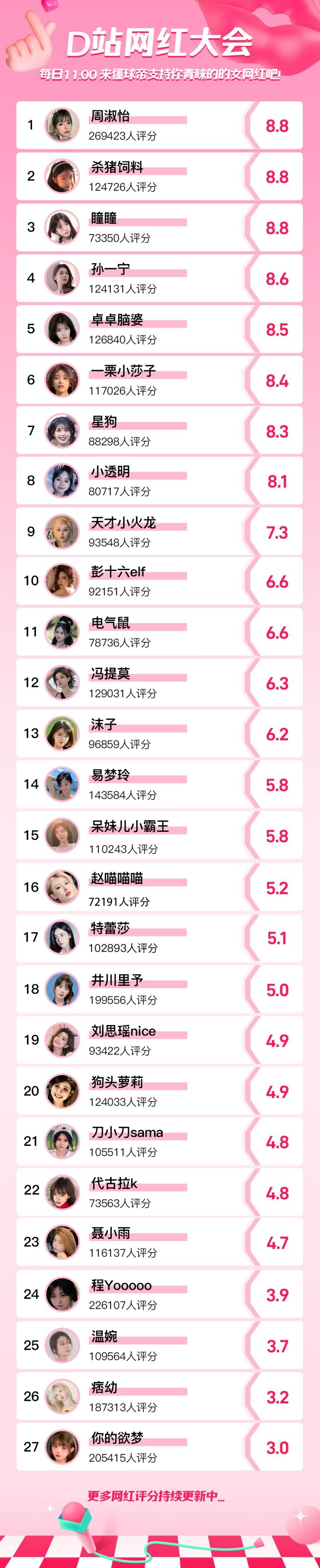 当前我懂老哥对各大网红们的喜爱值如下,谁最让你意外?你最中意的女网红是哪个?欢迎大家在评论区提名,活动君将会根据大家的提名结果判断采纳哦!