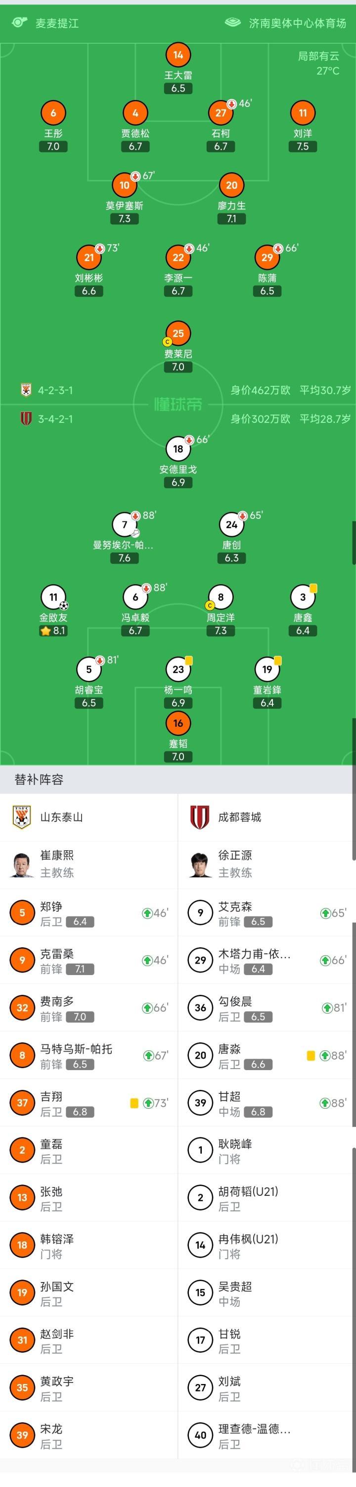 成都首发:16-蹇韬、5-胡睿宝(81′36-勾俊晨)、23-杨一鸣、19-董岩鋒、11-金敃友、6-冯卓毅(88′39-甘超)、3-唐鑫、8-周定洋、18-安德里戈(66′29-木塔力甫-依明卡日)、24-唐创(66′9-艾克森)、7-曼努埃尔-帕拉西奥斯(88′20-唐淼)