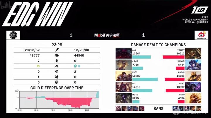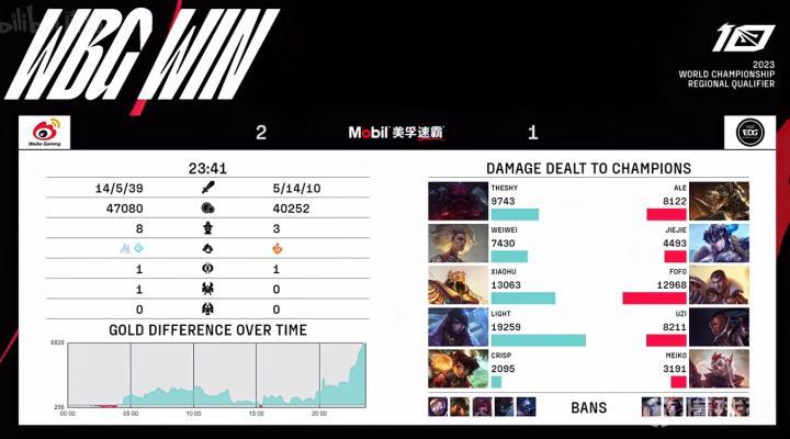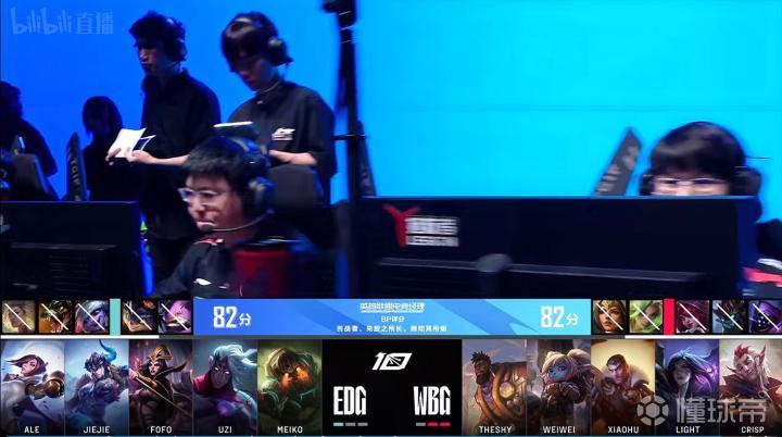 第23分钟,中路团战,Uzi收获三杀团灭WBG,EDG扳平比分。
