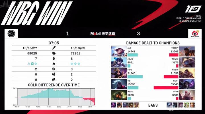 第37分钟,Weiwei波比率先阵亡,WBG反打打出1换3,随后推上高地,Light三杀收尾,WBG拿下比赛。
