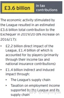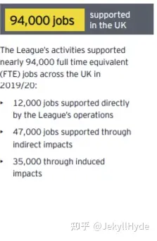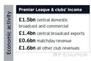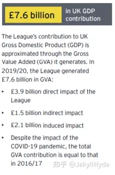 近30年后,到了19/20赛季,英超联赛创造的总产值为76亿英镑,其中: