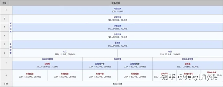 从校园到英超联赛,英格兰足球最终建立起了容纳了一共有超过140个不同联赛,包含多于480个组别,近5,300个俱乐部及超过7,000支球队参赛的24级足球联赛金字塔,分层形式的系统在联赛不同级别提供升降级机制,让每支球队均有机会爬到金字塔顶端。
