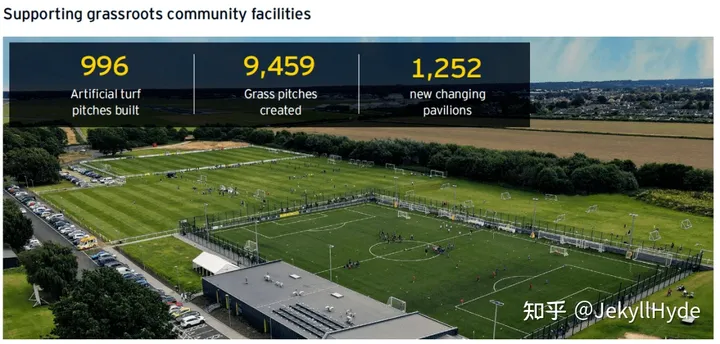 截止到19/20赛季,英超联赛在社区基础建设累计投入3.84亿英镑到公共基金,参与了996个人造草皮球场、9459个塑胶草皮球场的建设。