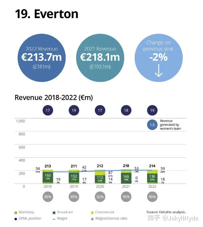 在2022财年,埃弗顿的收入为2.13亿英镑,位列全球第19。