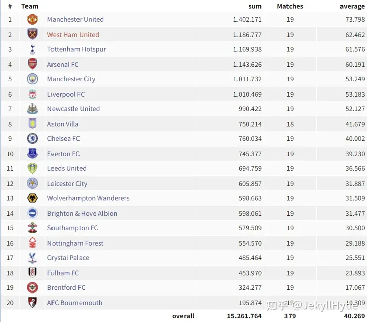 从软件方面,在2022/23赛季,英超总共吸引了15261764人次的观众,场均为40269人: