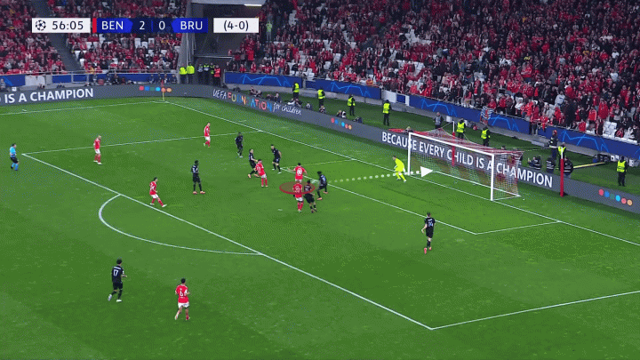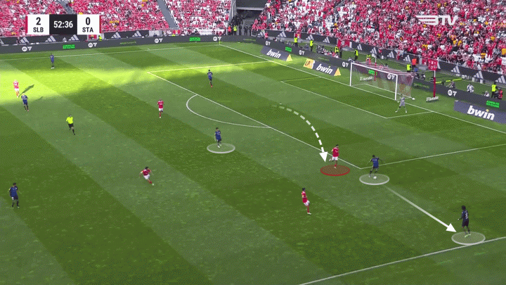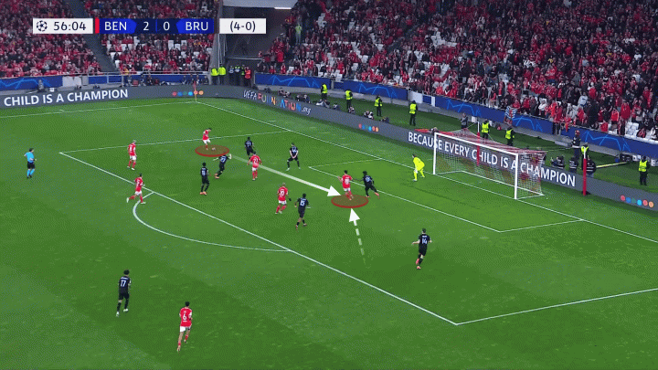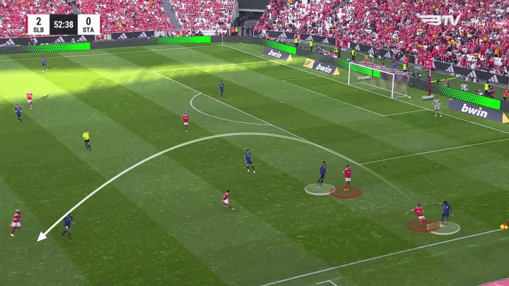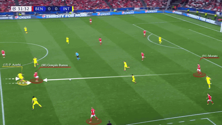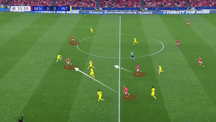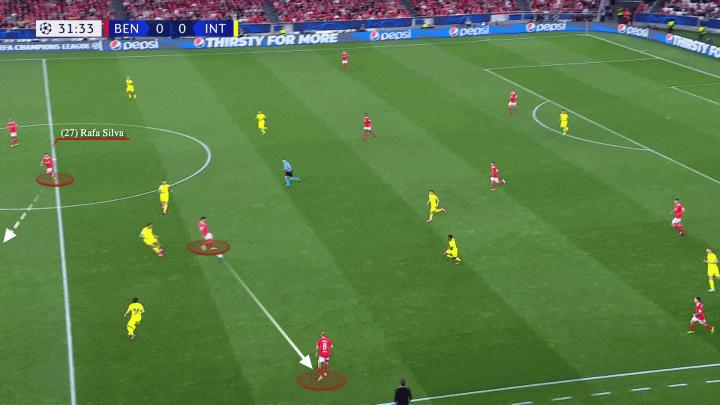 拉法-席尔瓦接球后,本菲卡得以向国际米兰的防线施压,他们的进攻轮换和第三人跑动使得球队能够快速向前推进。