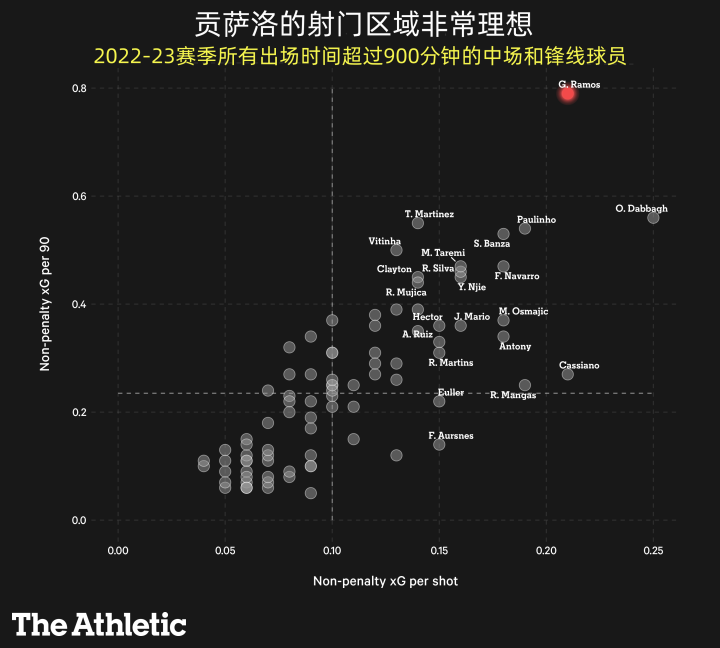 纵观上赛季葡超所有的中场和锋线球员,贡萨洛的场均0.79个非点球预期进球数高居第一,只有两名球员在射门质量上高于贡萨洛,也就是参考横轴显示的每脚射门的预期进球(非点球)。