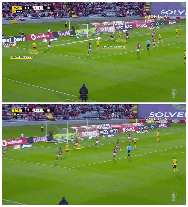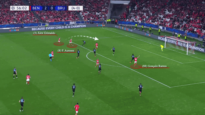 贡萨洛只是一个简单的一脚出球给到了左路的奥尔斯内斯,但拉法-席尔瓦已经开始跑动并利用了阿切尔比身后的空当。