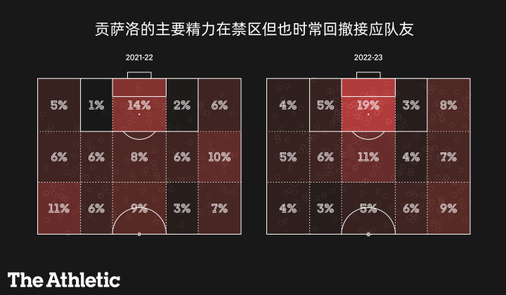 或许贡萨洛如此高产的原因之一是,他没有参与太多球队的进攻组织和策应工作。