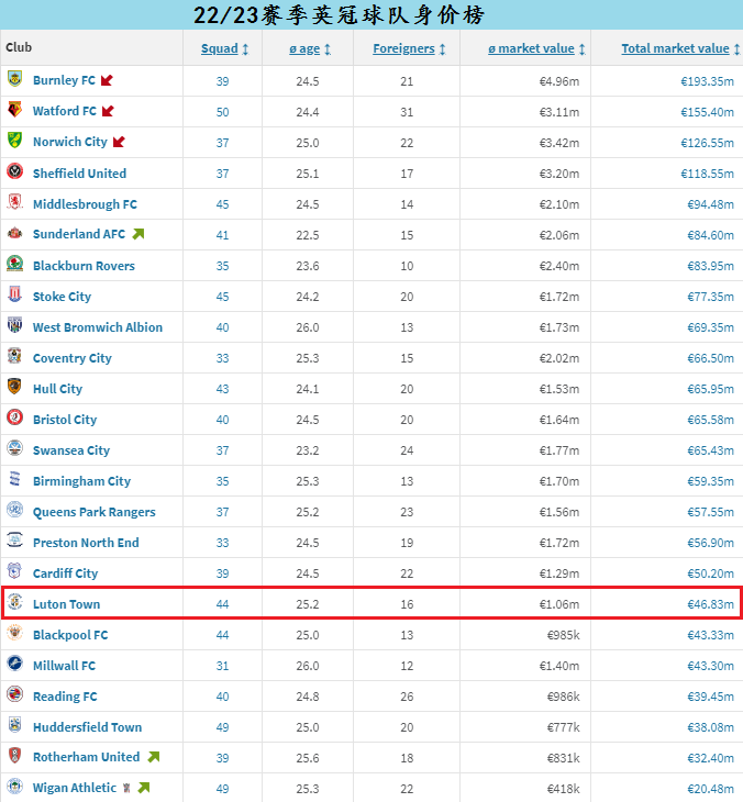 目前卢顿的最新总身价为6095万欧元,仅比上赛季多出了约1400万欧元,也是新赛季身价最低的英超球队。