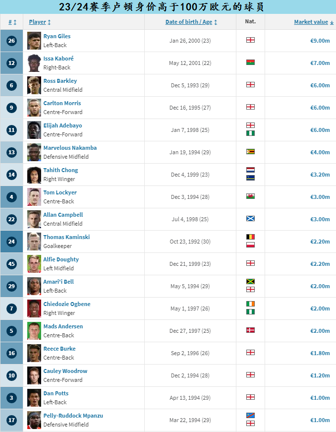 目前队内身价最高的本赛季新援贾尔斯,这名23岁的英格兰左后卫在今年夏天以585万欧元的转会费从狼队加盟,目前身价为900万欧元。球员阵容略显寒酸的卢顿也是本赛季英超中唯一没有千万欧元级别球员的队伍。