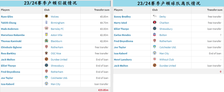其中的新援吉尔斯成为了队史首位转会费超过500万欧元的新援,球队在今年夏窗的转会投入也创造了俱乐部的历史新高。此外切尔西旧将巴克利从法甲尼斯自由转会加盟球队。