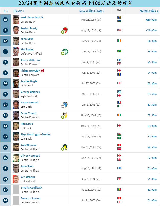 目前谢菲联的最新总身价为8250万欧元,比上赛季还缩水了约3800万欧元,也与卢顿一起成为了目前仅有的两支身价低于1亿欧元的英超球队。