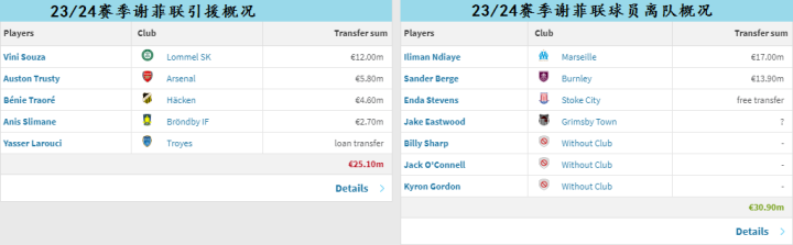 谢菲联是今年夏季转会窗至今唯一在转会市场中取得盈利的升班马,球队将上赛季表现出色的恩迪亚耶和博格分别出售给法甲马赛和直接保级对手伯恩利,共计收获了3090万欧元的转会收入。