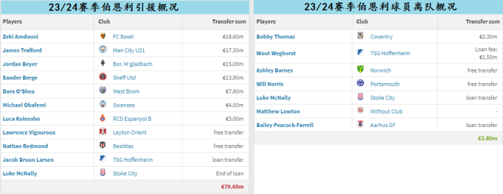 伯恩利在今年夏窗已经花费了约7960万欧元引进了约10名新援,有7名球员转会或租借离队。伯恩利目前也以7580万欧元的转会净投入位列本赛季英超转会净投入榜的第8位。