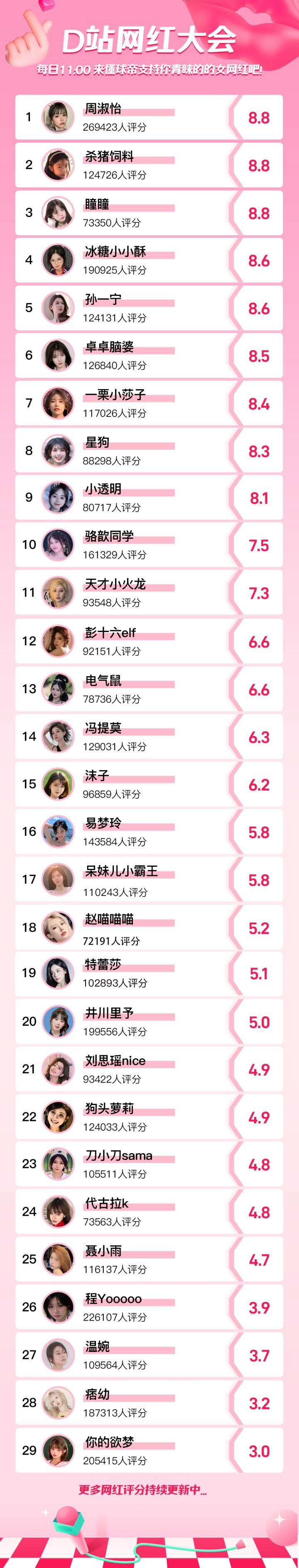 当前我懂老哥对各大网红们的喜爱值如下,谁最让你意外?你最中意的女网红是哪个?欢迎大家在评论区提名,活动君将会根据大家的提名结果判断采纳哦!