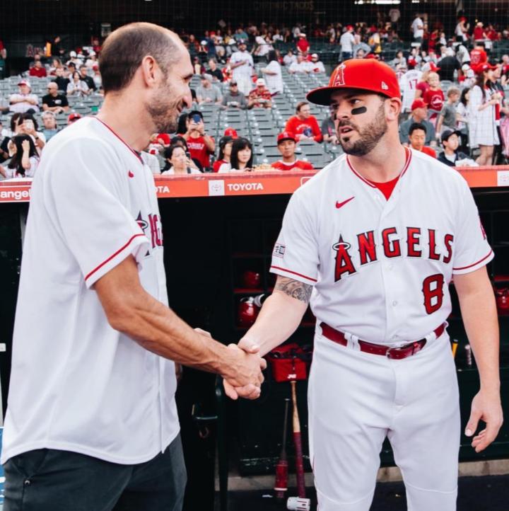 基耶利尼和洛杉矶天使队的一垒手穆斯塔卡斯握手并合影。