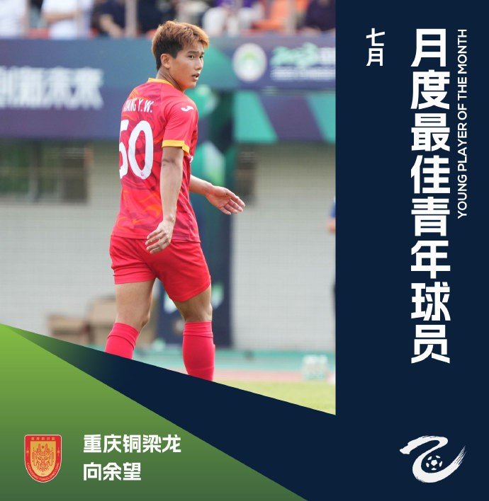 中乙联赛官方宣布,重庆铜梁龙队长向余望当选中乙联赛7月最佳青年球员。在七月,他收获两球两助,帮助球队取得了4胜1平的不败战绩,继续领跑南区积分榜。