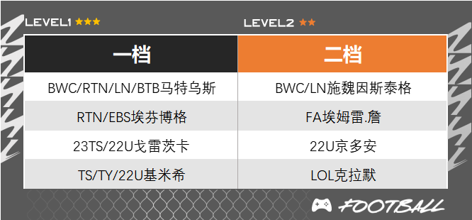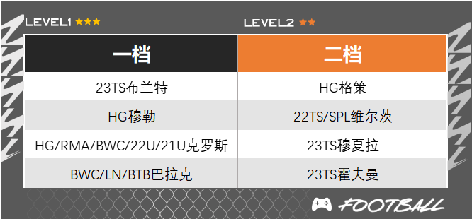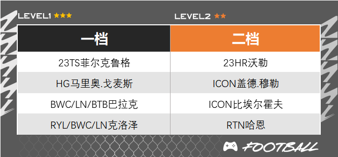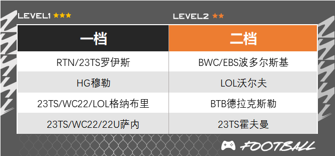 ○ 相比较来说,他们的工资较高是比较大的制约因素,特别是27的HG穆勒,虽然打边路加强了速率和传中,但BWC卡性价比要更高,远射也更精准。如果想省工资在其中一个边锋位置,可以考虑LOL赛季格纳布里、沃尔夫和萨内的高强卡,作为工具人边路送出传中还是没问题的。当然,像布兰特、哈弗茨这些模型偏大的球员,还是更推荐放在前腰位置送威胁直塞,打边路会有些不灵活,带球的速率也没有传统边路那么快。