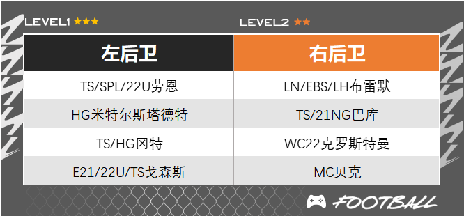 ○ 德国套的边后卫不缺人手,但很缺低工资的好卡,特别是19工资及以下的球员和拜仁套帕瓦尔、斯坦尼希奇,皇马套阿什拉夫等球员相比无论是速度、模型都相差一大截。相对而言,20工资的米特尔斯塔德特、戈森斯,21工资的克罗斯特曼是综合模型与回追能力来说更推荐的选择,如果玩家能接受混搭的话,可以用拜仁套的边后卫。