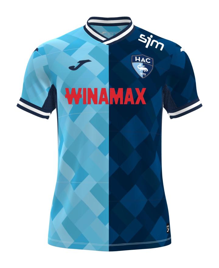 法甲升班马,主场球衣的设计很用心,在两种蓝色对半开的基础上还有斜着的深浅方格。就是广告有一点影响。