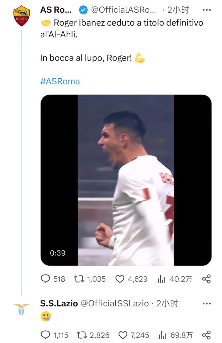 罗马官宣伊巴涅斯转会,拉齐奥官媒哭泣送别 飞翔的蓝鹰 飞翔的蓝鹰2023-08-11 05:34罗马俱乐部官方宣布巴西中卫伊巴涅斯转会加盟吉达国民。拉齐奥官方推特和官方微博都转发了这一消息,并打出了哭泣的表情,以送别这位拉齐奥球迷喜爱球员。展开更多