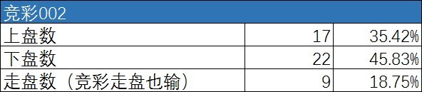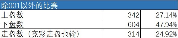 从001以外场次的上下盘情况来看,上盘率依旧偏低,仅为27%,下盘率接近半数,高达48%,走盘的概率最低,为25%.可以见得,下盘频出为近期竞彩的一大特点。
