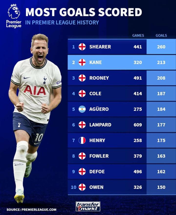 带着热刺第一射手和英超第二射手的荣誉,凯恩要去争夺属于自己的冠军了。 热刺队史射手榜前十: 1.凯恩* 280球 2.格里夫斯 266球 3.博比·史密斯 208球 4.马丁·奇弗斯 174球 5.克利夫·琼斯 159球 6.孙兴慜* 145球 7.迪福 143球 8.乔治·亨特 138球 9.邓克明 134球 10.吉尔泽安 133球 英超历史射手榜前十: 1.阿兰·希勒 260球 2.凯恩* 213球 3.鲁尼 208球 4.安迪·科尔 187球 5.阿圭罗 184球 6.兰帕德 177球 7.亨利 175球 8.罗比·福勒 163球 9.迪福 162球 10.欧文 150球 凯恩在上赛季打破了热刺队史进球记录,也将与英超进球记录缩小到了47球的差距。不过30岁的他没有任何一座正式比赛的冠军,在个人数据与荣誉之间,他确实应该去获得一些冠军荣誉了。祝福!