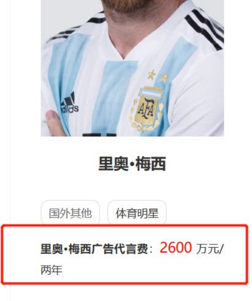 国内一家较为专业的知名明星代言代理网站显示,梅西广告代言费大概在2600万每两年,平均一年是1300万人民币。此前有媒体证实,梅西代言蒙牛的价格是4000万元(税后),但这并非是一年的费用。